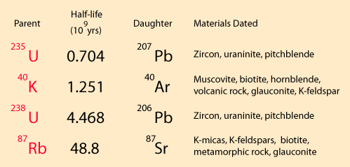 Clocks in the RocksThe following radioactive decay processes have proven particularly useful in radioactive dating for geologic processes: ![]() Lead isochrons are also an important radioactive dating process. Note that uranium-238 and uranium-235 give rise to two of the natural radioactive series, but rubidium-87 and potassium-40 do not give rise to series. They each stop with a single daughter product which is stable.