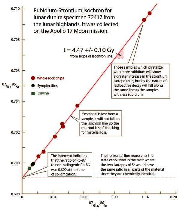 Age of the MoonOur best clues to the age of the Moon are the radiometric dates of the oldest Moon rocks, those from the lunar highlands. Dalrymple reports that thirteen samples from the lunar highlands gave the oldest ages. These were collected by Apollo 15, 16, 17 and Luna 20. The radiometric dates range from 3.9 to 4.5 Gy. If we take the oldest ages to be the age of the Moon, then we place that age at about 4.5 Gy. A sample of the kind of data that leads to such a projected age is the rubidium-strontium isochron of lunar sample 72417 which yields a time to last melting of 4.47 Gy. This isochron was discussed in Dalrymple and credited to Papanastassiou and Wassenburg, 1975. ![]()