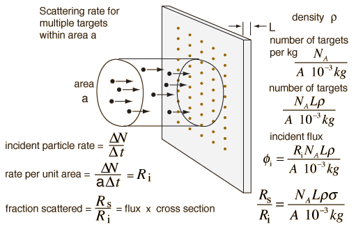 Scattering Cross SectionThe concept of cross section, as its name suggests, is that of effective area for collision. The cross section of a spherical target is ![]() The units of cross section are then area units, but for nuclear scattering the effective area is on the order of the cross sectional area of a nucleus. For a gold nucleus of mass number A=197, the radius determined from the nuclear radius relationship is about 7 fermis. ![]() The most common unit for cross section for nuclear scattering interactions is the barn. The cross section in barns for alpha scattering above a selected angle is a standard part of the analysis of Rutherford scattering. In the case of 6 MeV alpha particles scattered from a gold foil, for example, you don't know the impact parameter for any given alpha particle, so the calculation of the scattered fraction takes on a statistical character. For alpha particles bombarding a gold foil of thicknes 1 micrometer, less than 1 in 100,000 would meet the conditions for scattering at over 140°. The cross section for scattering at smaller angles will be larger, because the alpha doesn't have to come as close to be scattered through the smaller angle. For example, the cross section for scattering through 90° or above is 11.3 barns. For neutron scattering, there is no coulomb repulsion, so there is no appreciable scattering unless the impact parameter is less than the effective radius for the strong interaction. Therefore for a given target geometry the cross sections are smaller, typically measured in millibarns. Since the probability for interaction depends upon the strength and range of the interaction, the cross-sections for neutrino interactions are very small since they interact only by the weak interaction.