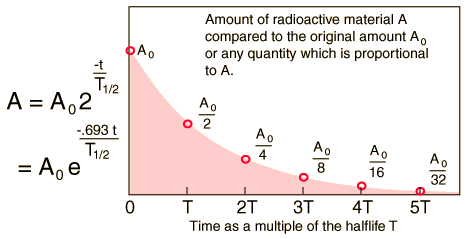 Radioactive Half-LifeThe radioactive half-life for a given radioisotope is the time for half the radioactive nuclei in any sample to undergo radioactive decay. After two half-lives, there will be one fourth the original sample, after three half-lives one eight the original sample, and so forth. ![]()