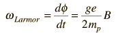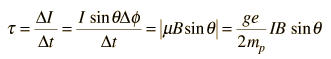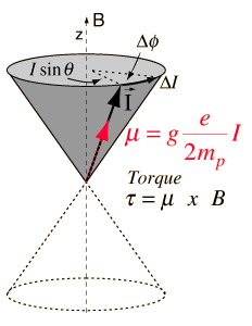 Larmor FrequencyWhen a magnetic moment is placed in a magnetic field it will tend to align with the field. Classically, a magnetic moment can be visualized as a current loop and the influence toward alignment can be described as the torque on the current loop exerted by the magnetic field. The idea of the magnetic moment as a current loop can be extended to describe the magnetic moments of orbital electrons, electron spins and nuclear spins. In each case the magnetic moment is associated with the angular momentum, and a torque can be identified which tends to align the magnetic moment with the magnetic field. In the nuclear case, the angular momentum involved is the intrinsic angular momentum I associated with the nuclear spin. When you have a magnetic moment directed at some finite angle with respect to the magnetic field direction, the field will exert a torque on the magnetic moment. This causes it to precess about the magnetic field direction. This is analogous to the precession of a spinning top around the gravity field. The torque can be expressed as the rate of change of the nuclear spin angular momentum I and equated to the expression for the magnetic torque on the magnetic moment ![]() which when put in derivative form gives a precession angular velocity ![]()