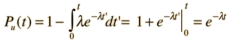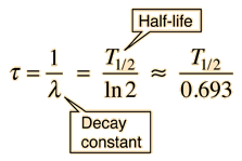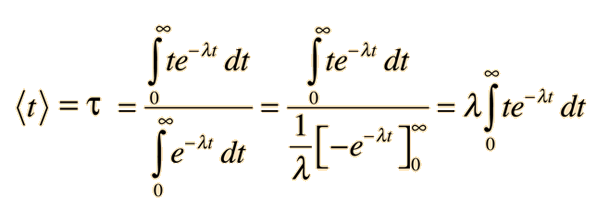 Mean Lifetime for Particle DecayThe decay of particles is commonly expressed in terms of half-life, decay constant, or mean lifetime. The probability for decay can be expressed as a distribution function ![]() To normalize this distribution function: ![]() The probability that a given particle will decay within time t is given by the integral of the decay distribution function from 0 to t. This is not the quantity which we wish to calculate - we want the average time the particle will exist without decaying. The probability that a particle is not decayed is one minus the probability that it will decay. The probability that a particle will remain at time t is then: ![]() The average survival time is then the mean value of time using this probability function. ![]() This integral may be evaluated by integration by parts. It is made slightly more direct by the substitution x = λt: ![]() So the mean lifetime for particle decay is given by ![]() Any quantity A which depends upon this decay can then be expressed as