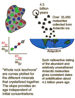 | The use of radioactive dating on meteorites removes some of the uncertainties of the process because they have not been subject to the severe weathering and other Earth processes which might affect the ratios of the constituents of other rocks. Particularly promising are the meteorites found in Antarctica since they have been well preserved in the ice. Intensive collection efforts since about 1970 have collected over 35,000 of these meteorites. |