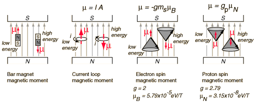 Nuclear Magnetic ResonanceWhen the nuclear magnetic moment associated with a nuclear spin is placed in an external magnetic field, the different spin states are given different magnetic potential energies. In the presence of the static magnetic field which produces a small amount of spin polarization, a radio frequency signal of the proper frequency can induce a transition between spin states. This "spin flip" places some of the spins in their higher energy state. If the radio frequency signal is then switched off, the relaxation of the spins back to the lower state produces a measurable amount of RF signal at the resonant frequency associated with the spin flip. This process is called Nuclear Magnetic Resonance (NMR). A magnetic dipole moment (usually just called "magnetic moment") in a magnetic field will have a potential energy related to its orientation with respect to that field. ![]() Note that the electron spin magnetic moment is opposite to the electron spin while the proton spin magnetic moment is in the direction of the proton spin. The electron spin or proton spin will tend to precess around the magnetic field with a frequency traditionally called the Larmor frequency. For a 1 Tesla magnetic field this Larmor frequency would be ![]() The Larmor frequency can be visualized classically in terms of the precession of the magnetic moment around the magnetic field, analogous to the precession of a spinning top around the gravity field. It can also be visualized quantum mechanically in terms of the quantum energy of transition between the two possible spin states for spin 1/2. This can be expressed as a photon energy according to the Planck relationship. The magnetic potential energy difference is hn = 2mB. The short table of Larmor frequencies below is from Hobbie, Ch 17 and Becker. An extensive list including the magnetic moments and Larmor frequencies of most elements can be found in Appendix A of Becker.