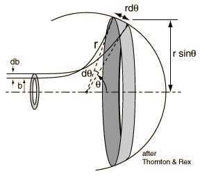 Scattering Cross SectionThe concept of cross section, as its name suggests, is that of effective area for collision. The cross section of a spherical target is ![]() The angle of scattering in Rutherford scattering depends upon the impact parameter, with larger deflection occurring for smaller impact parameters. The area of a circle of radius = b = impact parameter is then the cross section for scattering above the angle associated with b, since any particle arriving with r less than b will scatter to a larger angle. Therefore, the cross section for scattering at a greater angle than some chosen angle is ![]() Note that this expression is for alpha particles with Zp=2. For projectiles with another charge Zp, then you would multiply this expression by Zp2/4. ![]()