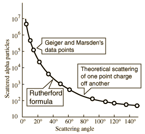 History of Rutherford ExperimentIn Ernest Rutherford's laboratory, Hans Geiger and Ernest Marsden (a 20 yr old undergraduate student) carried out experiments to study the scattering of alpha particles by thin metal foils. In 1909 they observed that alpha particles from radioactive decays occasionally scatter at angles greater than 90°, which is physically impossible unless they are scattering off something more massive than themselves. This led Rutherford to deduce that the positive charge in an atom is concentrated into a small compact nucleus. During the period 1911-1913 in a table-top apparatus, they bombarded the foils with high energy alpha particles and observed the number of scattered alpha particles as a function of angle. Based on the Thomson model of the atom, all of the alpha particles should have been found within a small fraction of a degree from the beam, but Geiger and Marsden found a few scattered alphas at angles over 140 degrees from the beam. Rutherford's remark "It was quite the most incredible event that ever happened to me in my life. It was almost as incredible as if you had fired a 15-inch shell at a piece of tissue paper and it came back and hit you." The scattering data was consistent with a small positive nucleus which repelled the incoming positively charged alpha particles. Rutherford worked out a detailed formula for the scattering (Rutherford formula), which matched the Geiger-Marsden data to high precision. The source used in the Rutherford experiments was purifed radium contained in a thin-walled 1-mm diameter glass tube. The source strength was about 0.1 Curie, or about 4 billion nuclear decays per second. The alpha particles were allowed to pass through a small diaphragm and were directed toward a thin foil target. The detector was a small (10-6 m2) zinc sulfide screen mounted a few centimeters away from the target. (Rohlf) |