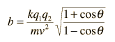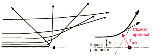 Determining the Impact ParameterBesides the masses of the target and projectile, the scattering angle depends upon the force and upon the impact parameter. The impact parameter is the perpendicular distance to the closest approach if the projectile were undeflected. ![]()