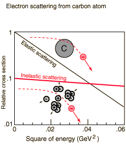 | In the energy range up to 0.06 GeV, the cross section for elastic scattering of electrons from carbon nuclei drops dramatically since it becomes more and more improbable for the carbon nucleus to remain intact under such energetic bombardment. The cross section for inelastic scattering in which the carbon nucleus breaks apart remains surprisingly near a constant value. This suggests that the electron is scattering off something within the nucleus which is structureless in this energy range. That scattering center is known to be a proton, and this scattering evidence for the existence of the proton forms a model for looking for even deeper structure.