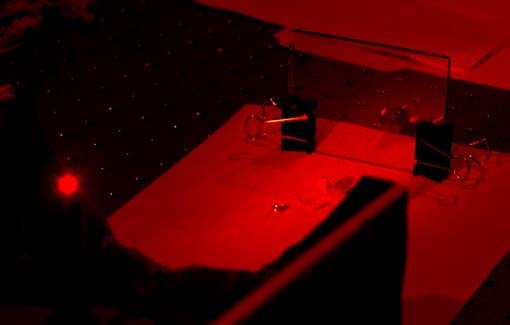 Transmission Hologram Setup![]() This is a photo of a setup used for making transmission holograms with a helium-neon laser. The film is sandwiched between glass plates as shown, with the objects in front of the plates. The laser beam is spread by a spherical lens of about 3 mm diameter, shown as the red glow at the left of the photo. The object used here consists of a small plastic soldier, a lens and some coins. On the glass plates can be seen part of the interference pattern. The film records the interference pattern between the |