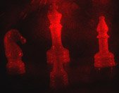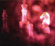 Three-Dimensional ImageHolograms are true three-dimensional images. This is evidenced by the fact that you can move your head while viewing the image and see it in a different perspective. This includes revealing part of the image which was hidden at another viewing angle. Shown below are three images from the same hologram, obtained by looking through it at different angles. Note that the pawn appears in different perspective in front of the king behind it.