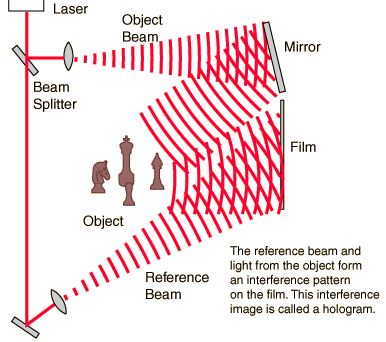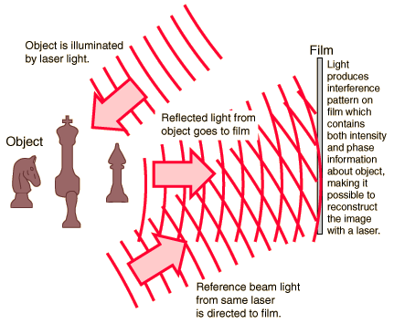 Interference ImagingHolography is "lensless photography" in which an image is captured not as an image focused on film, but as an interference pattern at the film. ![]() |