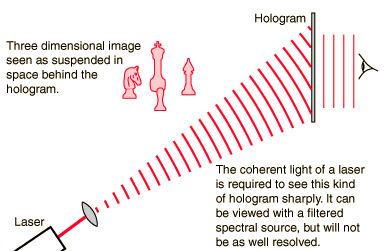 Viewing a Transmission HologramHolography is lensless photography. The image is captured in the interference pattern on the film, and the image can be reconstructed for viewing by shining the coherent light of a laser on the hologram. The eye is focused behind the film to see the image suspended in space. It shows the unique characteristics of holographic images. ![]() The diverged laser beam should be placed in the same orientation with respect to the film as the