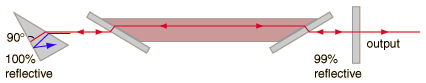 Tunable LasersThough laser action usually involves a transition between two atomic or molecular energy levels and it therefore essentially monochromatic light, there may be more than one set of levels which can be utilized in a given medium. For example, the helium-neon laser can produce green at 543.5 nm and infrared at 1523 nm as well as the familiar red 632.8 nm laser action. The dye lasers have so many possible laser transitions which are broad that some of them can be tuned over and almost continuous range. One convenient way to tune a laser is to place a prism or grating in the path to one of the mirrors as illustrated below. The prism is oriented so that the desired wavelength will be normally incident on the mirror at the back of the prism and therefore retrace its path back into the laser cavity. Other wavelengths with different indices of refraction will strike the mirror at a different angle and will be taken out of the beam. Since a grating is like a "super prism" with more dispersive power, more precise tuning could be obtained with a grating. ![]() |