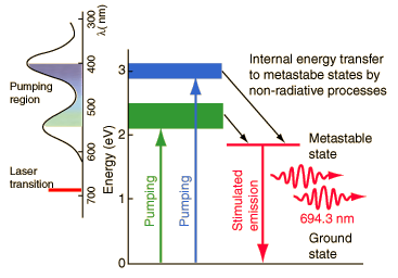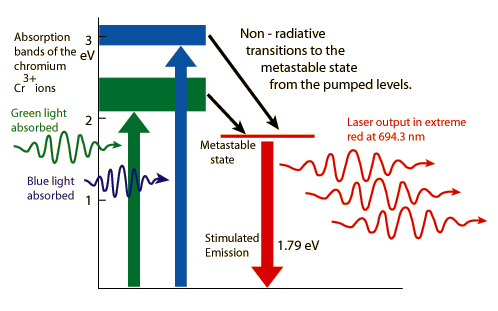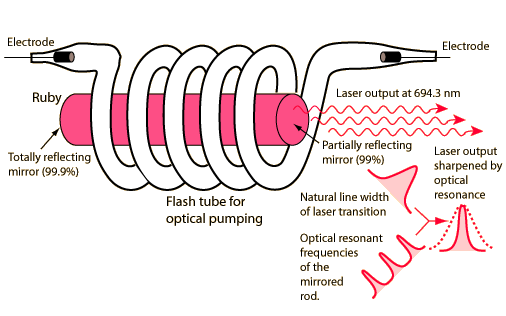 The ruby laser is used as a pulsed laser, producing red light at 694.3 nm. After receiving a pumping flash from the flash tube, the laser light emerges for as long as the excited atoms persist in the ruby rod, which is typically about a millisecond. A pulsed ruby laser was used for the famous laser ranging experiment which was conducted with a corner reflector placed on the Moon by the Apollo astronauts. This determined the distance to the Moon with an accuracy of about 15 cm. ![]() |