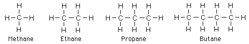 AlkanesHydrocarbons which contain only single bonds are called alkanes. They are called saturated hydrocarbons because there is a hydrogen in every possible location. This gives them a general formula CnH2n+2. The first four alkanes are methane, ethane, propane, and butane with the Lewis symbols shown below. ![]() Past this number of carbons, the -ane suffix is retained and the number prefixes penta-, hexa-, hept-, oct-, non-, dec-, etc are used. Alkyl groups are used as substituents, and alkane derivatives have many applications. The alkanes are highly combustible and are valuable as clean fuels, burning to form water and carbon dioxide. Methane, ethane, propane and butane are gases and used directly as fuels. Alkanes from pentane up to around C17H36 are liquids. Gasoline is a mixture of alkanes from pentane up to about decane. Kerosene contains alkanes from about n=10 to n=16. Above n=17 they are solids at room temperature. Alkanes with higher values of n are found in diesel fuel, fuel oil, petroleum jelly, paraffin wax, motor oils, and for the highest values of n, asphalt. Alkane derivatives are used in hundreds of products such as plastics, paints, drugs, cosmetics, detergents, insedticides, etc., so the fossil fuel resource from which we obtain the alkanes is much too valuable to burn it all as a motor fuel.