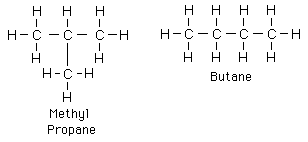 Alkane DerivativesAlmost an unlimited number of derivatives can be made from the alkanes since any hydrogen can be substituted by an alkyl group, a halide, etc. If the substituent is an alkyl group, then the derivative will have the same empirical formula as a larger alkane, so the empirical formula for an organic compound is insufficient to identify it. For example, if a methyl group is substituted for for one the hydrogens on the center carbon of a propane molecule, the result is called methylpropane. It has the same molecular formula as butane. These two molecules are said to be structural isomers.