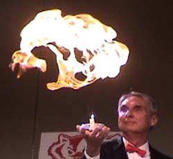 MethaneMethane is the lightest hydrocarbon of the class called alkanes. The first four alkanes are methane, ethane, propane, and butane with the Lewis symbols shown below. ![]() Methane is the major constituent of natural gas. It is lighter than air and very flamable. Both of those properties are shown in the images below which feature physics professor Clint Sprott of the University of Wisconsin in his "Wonders of Physics" demonstration show. Natural gas is passed through a bubble mixture to produce bubbles on the order of 10 cm in diameter. As these bubbles rise, he touches a lighted candle to one of them.