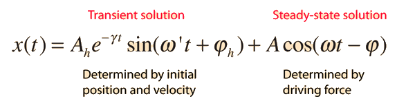 Steady-State Solution, Driven OscillatorThe solution to the driven harmonic oscillator has a transient and a steady-state part. The steady-state solution is the particular solution to the inhomogeneous differential equation of motion. It is determined by the driving force and is independent of the initial conditions of motion.Examples of driven oscillators |