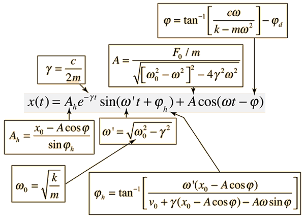 In the underdamped case this solution takes the form ![]() The initial behavior of a damped, driven oscillator can be quite complex. The parameters in the above solution depend upon the initial conditions and the nature of the driving force, but deriving the detailed form is an involved algebra problem. The form of the parameters is shown below. Details of parameter evaluationExamples of driven oscillators