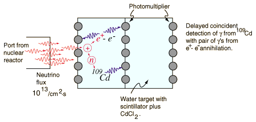 Cowan and Reines Neutrino ExperimentFrom the study of beta decay like the decay of the neutron, it was evident in the 1930's that a third particle must be present. But since that particle, named the neutrino, had no charge and almost no mass, it was difficult to detect. In the mid 1950's, Frederick Reines and Clyde L. Cowan, Jr. came up with an experiment to verify the existence of the neutrino. It made use of the fact that nuclear reactors were expected to produce neutrino fluxes on the order of 1012-1013 neutrinos per second per cm2, far higher than any attainable flux from radioactive sources. Neutron decay and other beta decay events produce electron antineutrinos. Those antineutrinos should interact with protons to produce neutrons and positrons. ![]() The positrons quickly find electrons and produce two gamma rays by pair-annihilation, a very distinctive event in that you can simultaneously detect the two 0.5 MeV gammas in opposite directions. But Reines and Cowan realized that the coincident detection of the pair annihilation gammas was not quite proof of neutrino detection by this reaction. They arranged to detect the neutron from the reaction as well to confirm the occurrence of this reaction. The gamma photons were detected by putting a scintillator material in a tank of water. The scintillator produced flashes of visible light in response to the gamma photons, and that light was detected by photomultiplier tubes. The neutrons were detected by putting cadmium chloride into the detector tank. Cadmium is a strong neutron absorber and finds use in control rods for nuclear reactors because of that. When absorbing a neutron, 108Cd produces an excited state of 109Cd which subsequently emits a gamma ray. ![]() The experimental arrangement was such that the additional gamma from this process was detected within about 5 x 10-6 seconds after the e+-e- pair-annihilation gammas. This provided a distinctive signature for the neutrino reaction - the gamma pair in coincidence plus another gamma within 5 μs. ![]() After a preliminary experiment at Hanford, Reines and Cowan moved the experiment to the Savannah River Plant near Augusta, where they had better shielding against cosmic rays. This shielded location was 11 m from the reactor and 12 m underground. In the 1956 experiment they used two tanks with a total of about 200 liters of water with about 40 kg of dissolved CDCl2 dissolved in it. The water tanks were sandwiched between three scintillator layers which contained 110 5-inch photomultiplier tubes. After months of data collection, they had accumulated data on about three neutrinos per hour in their detector. As additional confirmation that they were seeing neutrino events from the detection scheme described above, they shut down the reactor to show that there was a difference in the number of detected events. They had predicted a cross-section for the reaction to be about 6 x 10-44 cm2 and their measured cross-section was 6.3 x 10-44 cm2.Their results were published in 1956. Frederick Reines was honored by the Nobel Prize in 1995 for his work on neutrino physics. Original papers: "The Neutrino", Frederick Reines and Clyde L. Cowan, Jr., Nature 178, 446 (1956).
