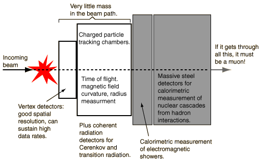 - "If it got through all that, it must be a muon!" Detecting muons by the fact that they penetrate all the calorimetric detectors.