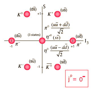 The pseudoscalar mesons have quark and antiquark spins antialigned and zero orbital angular momentum, resulting in j=0. They have negative parity. The diagrams are plotted with strangeness on the vertical axis and isospin on the horizontal axis.