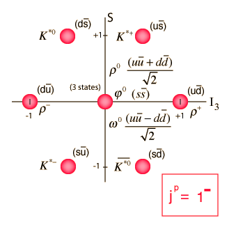 The vector mesons have quark and antiquark spins aligned and zero orbital angular momentum, resulting in j=1. They have negative parity. The diagrams are plotted with strangeness on the vertical axis and isospin on the horizontal axis.
