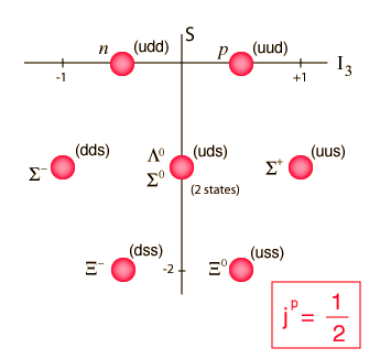 The diagrams are plotted with strangeness on the vertical axis and isospin projection on the horizontal axis.
