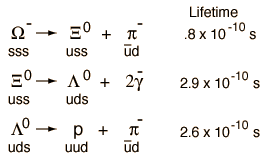 | Omega | Ω- | sss | 1672 | 3/2 | +1 | -3 | 0.82 x10-10 | Ξ0π-, Λ0K- |