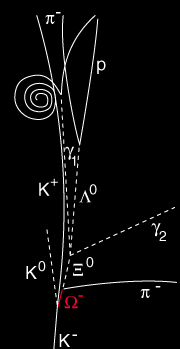 At left is a sketch of the bubble chamber photograph in which the omega-minus baryon was discovered.