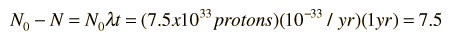 The number of protons N can be modeled by the decay equation ![]() where l = 1/t = 10-33/ year is the probability that any given proton will decay in a year. Since the decay constant l is so small, the exponential can be represented by the first two terms of the exponential series. ![]() For a small sample, the observation of a proton decay is infinitesmal, but suppose we consider the volume of protons represented by the Super Kameokande neutrino detector in Japan. The number of protons in the detector volume is reported by Ed Kearns of Boston University to be 7.5 x 1033 protons. For one year of observation, the number of expected proton decays is then ![]() About 40% of the area around the detector tank is covered by photodetector tubes, and if we take that to be the nominal efficiency of detection, we expect about three observations of proton decay events per year based on a 1033 year lifetime. So far, no convincing proton decay events have been seen. Poisson statistics provides a convenient means for assessing the implications of the absence of these observations. If we presume that a = 3 observed decays per year is the mean, then the Poisson distribution function tells us that the probability for zero observations of a decay is ![]() This low probability for a null result suggests that the proposed lifetime of 1033 years is too short. While this is not a realistic assessment of the probability of observations because there are a number of possible pathways for decay, it serves to illustrate in principle how even a non-observation can be used to refine a proposed lifetime. |
