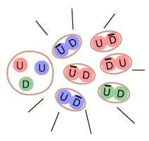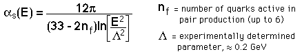 Asymptotic FreedomAs the quarks within a meson or baryon get closer together, the force of containment gets weaker so that it asymptotically approaches zero for close confinement. The implication is that the quarks in close confinement are completely free to move about. Part of the nature of quark confinement is that the further you try to force the quarks apart, the greater the force of containment. This is often visualized in terms of the "bag model" of quark confinement. A potential function which has been successfully used to describe some quark systems is of the form: ![]() The quark-quark coupling strength decreases for small values of r, and Rohlf describes this qualitatively as resulting from the penetration of the gluon cloud surrounding the quarks. The gluons carry "color charge" and therefore the penetration of the cloud would reduce the effective color charge of the quark. Another approach to asymptotic freedom is to use a variable strong force coupling constant which depends upon the wavelength of the quark. An expression which comes from quantum chromodynamics is: ![]() |