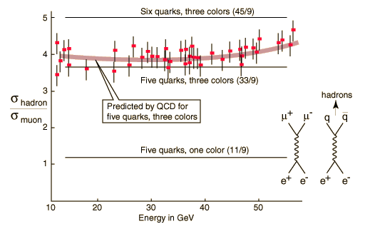 Electron-Positron Annihilation Provides Evidence of Three Colors for QuarksOne of the definitive experiments which supports the quark model is the high energy annihilation of electrons and positrons. The annihilation can produce muon-antimuon pairs or quark-antiquark pairs which in turn produce hadrons. The hadron events are evidence of quark production. The ratio of the number of hadron events to the number of muon events gives a measure of the number of "colors" of the quarks, and the evidence points to five quarks with three colors. With the more recent evidence for the top quark, these experiments provide support for the standard model of six quarks with three colors. The models which are evoked to explain the experimental results illustrated below involve the calculated cross-sections for the scattering events. It is helpful that the same type of scattering events, i.e., electron-positron scattering, can yield either two muons (leptons) or a variety of hadron products, any one of which suggests the creation of quarks. The experimental handle is then the relative frequency of the hadron events compared to the muon events. The calculated ratio of the products is the ratio of the cross-sections, and this ratio depends upon the ratio of the squares of the electric charges of the products. The calculated ratio then depends upon the number of types of quark-antiquark pairs which can be produced. So it has the form If we use the five quarks which would be available in this energy regime, the u, d, s, c and b quarks, then we get which is obviously wrong compared to the experiment. But when we take into account the three colors, we obtain This produces good agreement with the experimental observations over a wide range of energy when the quantum chromodynamic corrections are applied. Obviously, there is a great deal which is not being said here about the details of the calculations. But hopefully it can be seen that this kind of experimental evidence is a strong check on the standard quark model. It includes the model's charges of 2e/3 and e/3, the five types of quarks, and the three colors. ![]() The sixth quark is not seen because the energies used are not sufficient to produce the top-antitop quark pair. |