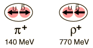 The difference between a pion and a rho is the spin alignment of the quarks. The pion is a pseudoscalar meson with zero angular momentum. The quarks have spin 1/2 and the spins are "paired" or anti-aligned. In the rho meson, a vector meson, the angular momentum is j=1, indicating parallel spins. Under the influence of the strong color force, the state with spins aligned has a higher energy which shows up as a larger mass energy. The analogy to the higher energy of aligned spins in a magnetic field (Zeeman effect) is instructive, but this difference in energy associated with the color force is enormous. ![]() Georgi comments "There is good reason to believe that most of the mass of the quark that we 'see' in the mass of the proton or the rho is a dynamical effect of quark confinement, that the u and d quarks in the underlying QCD theory actually have masses much smaller than 1/3 the mass of the proton." |