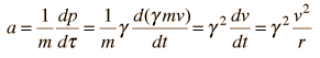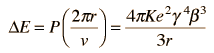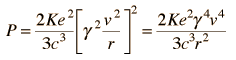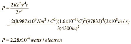 Synchrotron RadiationSynchrotron radiation is the name given to the radiation which occurs when charged particles are accelerated in a curved path or orbit. Classically, any charged particle which moves in a curved path or is accelerated in a straight-line path will emit electromagnetic radiation. Various names are given to this radiation in different contexts. For example, when is occurs upon electron impact with a solid metal target in an x-ray tube, it is called "brehmsstrahlung" radiation. Particularly in the application to circular particle accelerators like synchrotrons, where charged particles are accelerated to very high speeds, the radiation is referred to as synchrotron radiation. This radiated energy is proportional to the fourth power of the particle speed and is inversely proportional to the square of the radius of the path. It becomes the limiting factor on the final energy of particles accelerated in electron synchrotrons like the LEP at CERN. In other contexts like the detector arrays in accelerators, it can be detected and used as an aid to analyzing the products of the scattering event in the accelerator. The classical formula for the radiated power from an accelerated electron is ![]() For a non-relativistic circular orbit, the acceleration is just the centripetal acceleration, v2/r. The orbits of interest in accelerators are highly relativistic, so the relativistic acceleration can be gotten from ![]() where ![]() and m is the rest mass of the particle and the time rate of change of g is neglected. That assumption really needs to be defended more rigorously*, but it appears that the v4 term should dominate. The radiated power is then ![]() Since the velocity becomes nearly constant for highly relativistic particles, the term g4 becomes the dominate variable in determining loss rate. This means that the loss scales as the fourth power of the particle energy gmc2. For an accelerator like a synchrotron, the radius is fixed after construction, but the inverse dependence of synchrotron radiation loss on radius argues for building the accelerator as large as possible. The LEP electron synchrotron has a rated energy of 50 GeV and a radius of 4300 meters. This gives a relativistic gamma of about 98,000 compared to a gamma of 54 for a 50 GeV proton (see relativistic kinetic energy calculation). At that energy, the velocity is essentially c, so the synchrotron radiation power for a single electron can be calculated as follows: ![]() Two-tenths of a microwatt may not sound like much loss, but per electron it is enormous! At this energy the proton velocity would also be essentially c, so the synchrotron radiation loss for the two particles scales like their gammas. So the loss rate for the electron is (97833/54)4 or over 1013 times the loss for a proton of the same energy in the same synchrotron. The loss of energy per orbit can be calculated from ![]() *At the high value of gamma associated with these electrons, it is not valid to leave out the velocity term in gamma if you are treating that velocity the same as the other velocity term. Applying the straight chain rule for differentiation would make the term with the derivative of gamma even larger than the other term. However, on physical grounds, the velocity in the gamma is that associated with the dynamical effects, and at a given speed around the circle, it is not changing with time. The term which gives v2/r is associated with the change in direction, and must be included. |