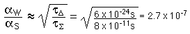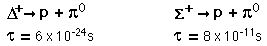 Decays Caused by Weak and Strong ForcesThe strong interaction and weak interaction can be compared in a set of particle decays which yield the same final products: ![]() The extraordinary difference of 13 orders of magnitude in the lifetimes comes from the fact that the sigma decay does not conserve strangeness and therefore can proceed only by the weak interaction: ![]() The lifetime of a decay is proportional to the inverse square of the coupling constant between the initial and final products, and since the final products are identical, the difference in lifetime must come from the difference in coupling constants. The coupling constant ratio can then be estimated for this situation: ![]() . |
