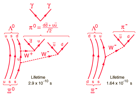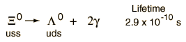 In this decay of the Xi particle, a lambda baryon and two gamma rays are shown as the products. Actually, the primary decay of the Xi is to a lambda-zero and a pi-zero meson. This cannot be a purely electromagnetic decay because strangeness is not conserved. Also, it's lifetime in the range of 10-10 seconds puts it in the common range for weak-interaction decays. It is just that the π0 decays into two gammas with a lifetime of about 10-16 seconds (an electromagnetic decay), so the two gamma rays appear to come from the same point as the lambda.