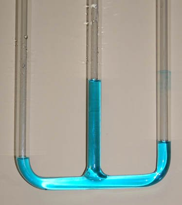 The flow in this system is from left to right, driven by a high pressure air supply. Note that the liquid level in the right hand tube is slightly higher, indicating that the pressure there is slightly less than that at the left hand tube. This is indicative of the normal pressure drop in a flowing fluid since the diameters of the top tube are the same at the left and right tubes. |