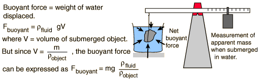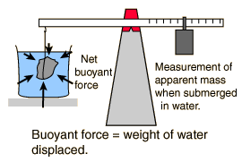 Note that in the experimental arrangement, the container of fluid in which the object is submerged is supported on a platform so that the balance scale does not include the measurement of the mass of the water and its container.
