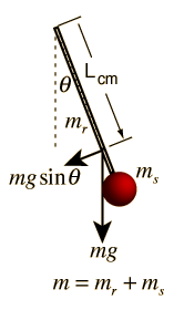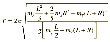 For a rod of length L = cm and mass mr = gm attached to a sphere of radius R=cmand mass ms = gm, with an acceleration of gravity g=m/s2, the period is T = s compared to a period of s for a simple pendulum for which length equals the distance to the center of mass of the sphere.