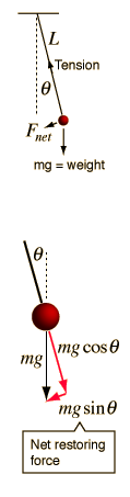 Period of Simple PendulumA point mass hanging on a massless string is an idealized example of a simple pendulum. When displaced from its equilibrium point, the restoring force which brings it back to the center is given by: