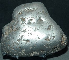 Platinum is a grayish-white precious metal. Platinum metal is rare in nature, but the nugget at right was found in the Urals of Russia. Platinum rivals gold in value and is used for jewelry. It is very ductile and can be welded at red heat. It is used in high temperature metal alloys. It has a very small amount of chemical activity and as a result is used for electical contacts under corrosive laboratory conditions. |  |
