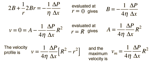 Velocity Equation, Tube Flow![]() Collecting terms gives the velocity equation in terms of radius r. ![]()
