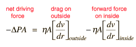 Velocity Relationship, Tube FlowThe nature of viscosity is such that successive lamina in the tube exert forces on each other according to the viscous force relationship: ![]() When a pressure gradient dP/dx drives a section of lamina of length Δx at constant velocity, the force equation takes the form: ![]()