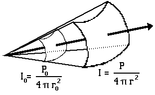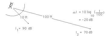 ![]() Figure 2: Illustrations of the Inverse Square Law With the inverse square law, the sound level will drop six decibels with each doubling of the distance from the source. The relationship is change in dB = 10 log10(I/I0) = 10 log10(r02/r2) = 10 log10(1/4) = -6 dB. If we choose a set of distances for our simplified model which are related to each other by doublings, then we can use the 6 dB rule to examine the potential acoustic gain with minimal computation. Assume Ds = 2 ft Source = 80 dB (forte ) at 2 ft D1 = 32 ft at the microphone D2 = D0 = 128 ft Now with these values the sound intensity is 44 dB (music level ppp) at the listener when there is no amplification (D0 = 128 ft, drop 6 dB for each doubling from 6 ft until you reach 128 ft.) The maximum electronic amplification you can use is determined by feedback considerations. Feedback will occur when the sound signal returning to the microphone from the loudspeaker is as strong as the original signal (in this case, 80 dB). The returning signal will be reamplified and sent back to the speaker and around the loop again. Under this condition you can walk up to the microphone and play one note and go home - the signal will "chase its tail" around the amplifecation system and produce sound the rest of the day. If the signal "feeding back" is stronger than the original signal, then it will continue to build up with each circuit until it reaches the maximum output of the amplifier, blows the speaker cone, or burns up the output stages of the amplifier. Practically speaking, there is usually one frequency of maximum gain which will start feedback first, so a system will usually "ring" or feedback at a single frequency. If your hypothetical system is at the feedback point with 80 dB returned to the microphone by the loudspeaker, (a distance of 32 ft from the loudspeaker), then it is at maximum gain. By the 6 dB rule, the amplified sound at the listener's distance from the loudspeaker (128 ft) is at 68 dB. Therefore, the potential acoustic gain of this system is P.A.G. = 68 dB - 44 dB = 24 dB. Equivalently, the potential acoustic gain can be calculated by
