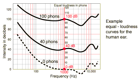 A musical composition which is perceived to be well balanced at the front of the auditorium will be perceived to be deficient in bass at the rear of the auditorium unless some bass boost occurs. This is often explained by saying "High frequencies carry better than low frequencies." - but in terms of the sound transmission, quite the opposite is true. You have no doubt observed that the thunder from nearby lightning is a sharp crack, while distant thunder is a low rumble. Part of the physical reason is that high frequency sounds are absorbed by the air more efficiently than lows - hence more of the lows reach you over a long distance. This low rumble of distant thunder is also enhanced by the fact that low frequencies are more efficiently structure-borne through the earth, buildings, etc. Also, their longer wavelengths lead to more diffraction around buildings and other obstructions in their path. The situation in an auditorium differs in that none of the "distant thunder" effects really apply, and one can reasonably assume that all frequencies travel equally well. Air absorption is not a significant factor in most auditoriums, so the bass boost occurs because most building materials, particularly woods, absorb high frequencies more readily than low frequencies. In summary, if the sound is soft it needs to have more bass because the ear discriminates against low frequencies more and more as the sound gets softer. This is shown by the comparison of the human hearing curves for loud and soft sounds in Figure 3. The rise in the low frequency end of the hearing curve for soft sounds means that more low frequency sound energy will be needed to achieve equal loudness. This undesirable bass discrimination of the ear is overcome if there is more low frequency reverberation than high in the auditorium. The needed bass boost is contributed by having a longer reverberation time for low frequencies. Procedure Pass the output of the white noise generator through the Pasco tunable filter to the audio amplifier. Use the "band pass" mode of the filter to transmit only a norrow band of frequencies. Start with 100 Hz and measure the reverberation time as described in the previous section. Repeat for 200, 400, 800, 1200, 1600, 2000, 4000 Hz and plot the reverberation time as a function of frequency.