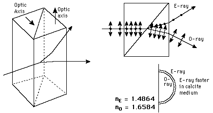 Wollaston PrismThe Wollaston prism is a polarizing beam splitter, preserving both the O- and E-rays. It is usually made from calcite or quartz. ![]() The Wollaston prism is made up of two right triangle prisms with perpendicular optic axes. At the interface, the E-ray in the first prism becomes an O-ray in the second and is bent toward the normal. The O-ray becomes an E-ray and is bent away from the normal. The beams diverge from the prism, giving two polarized rays. The angle of divergence of these two rays is determined by the wedge angle of the prisms. Commercial prisms are available with divergence angles from 15° to about 45°. They are sometimes cemented with glycerine or castor oil, and sometimes not cemented if the power requirements are high.
