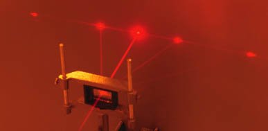 Diffraction Grating and Helium-Neon Laser![]() While directing the 632.8 nm red beam of a helium-neon laser through a 600 lines/mm diffraction grating, a cloud was formed using liquid nitrogen. You can see the direct beam plus the first and second orders of the diffraction. ![]() Another way to visualize the diffraction is to take a time exposure while sweeping a ground glass through the beams. This "paints in" the beams of the diffracted laser light. |
