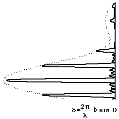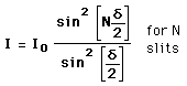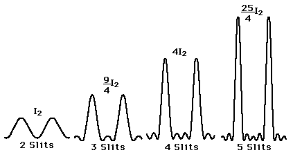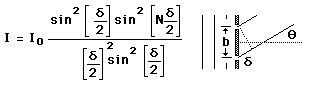 Grating Intensity ComparisonThe grating intensity expression gives a peak intensity which is proportional to the square of the number of slits illuminated. Increasing the number of slits not only makes the diffraction maximum sharper, but also much more intense. If a mm diameter laser beam strikes a line/mm grating, then it covers slits and the resulting line intensity is x that of a double slit. ![]() |