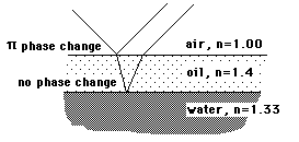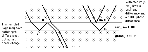 Reflection Phase ChangeReflected light will experience a 180 degree phase change when it reflects from a medium of higher index of refraction and no phase change when it reflects from a medium of smaller index. This phase change is important in the interference which occurs in thin films, the design of anti-reflection coatings, interference filters, and thin film mirrors. ![]() |